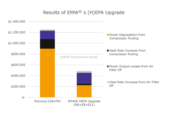 A common concern with (H)EPA systems is their higher initial pressure drop. However, field data clearly confirmed: the financial savings from reduced compressor fouling exceeded the additional cost of higher pressure drop by a factor of 14.