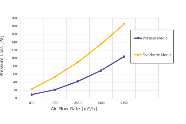 The pressure differential of synthetic or glass fibre media is increasing massively after a short while whereas the Poret® coalescer media offers an optimum balance of constantly filtration performance and minimum increase in pressure drop over their entire service life. Thereby the pressure differential will increase slowly and remain after while virtually constant.